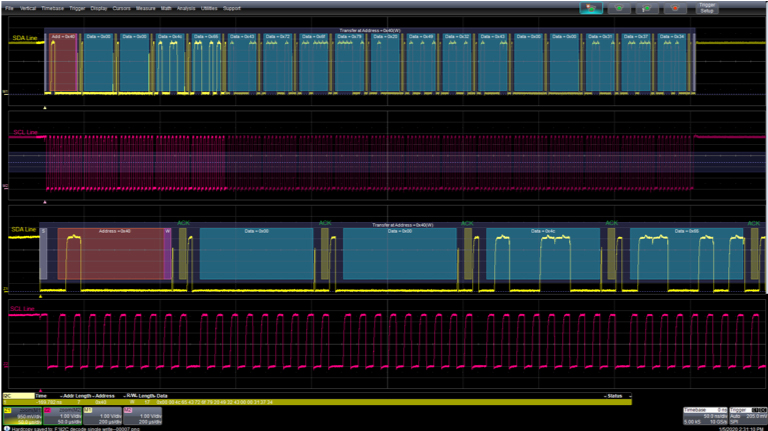Górny ślad pokazuje cały pakiet I2C SDA od początku do końca. Bezpośrednio pod nim znajduje się odpowiadający mu sygnał SCL. Trzecim śladem od góry jest rozciągnięte w czasie przybliżenie śladu sygnału SDA, a pod nim znajduje się odpowiadający mu sygnał SCL.