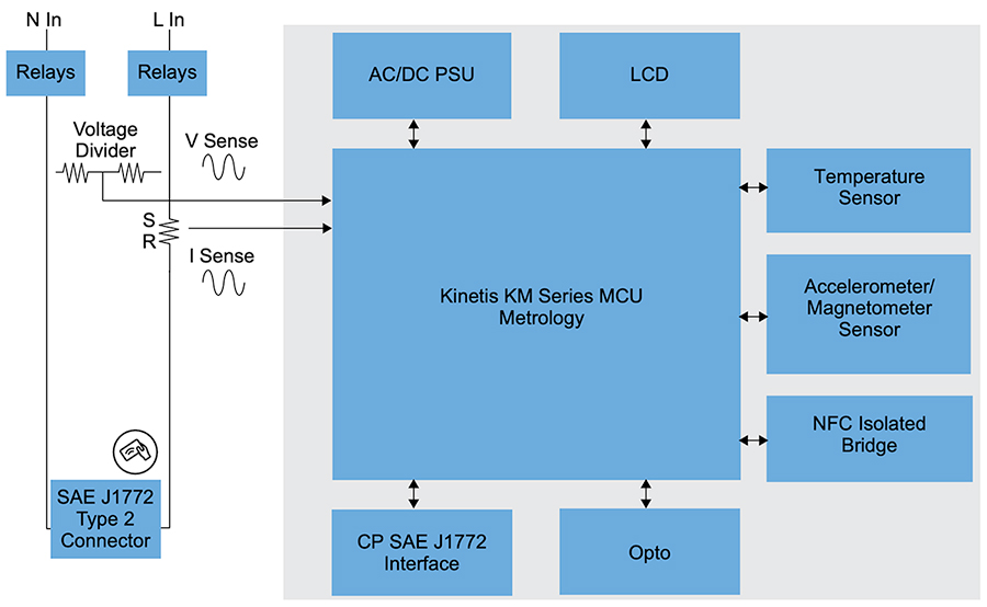 Aby uprościć wdrażanie metrologii, układ front-end mikrokontrolera MCU KM35x posiada zintegrowany bardzo dokładny przetwornik analogowo-cyfrowy (ADC) sigma-delta, przetwornik analogowo-cyfrowy o sukcesywnej aproksymacji (SAR ADC), do czterech wzmacniaczy z programowanym wzmocnieniem (PGA), szybki komparator analogowy (HSCMP), blok logiczny kompensacji fazy oraz wewnętrzny wzorzec napięcia (VREF) wysokiej precyzji z niskim dryftem temperaturowym. Dla zabezpieczenia integralności jednostki metrologicznej przewidziano wbudowane funkcje zabezpieczeń z aktywnym, jak i pasywnym wykrywaniem nieautoryzowanych ingerencji ze znacznikami czasu. Używane w połączeniu z zewnętrznymi czujnikami, przekaźnikami i innymi urządzeniami peryferyjnymi bloki te zapewniają pełną funkcjonalność niezbędną do szybkiego wdrożenia zaawansowanego podsystemu metrologicznego dla układu front-end gniazda zasilania systemu ładowania pojazdów elektrycznych (ilustracja 3).